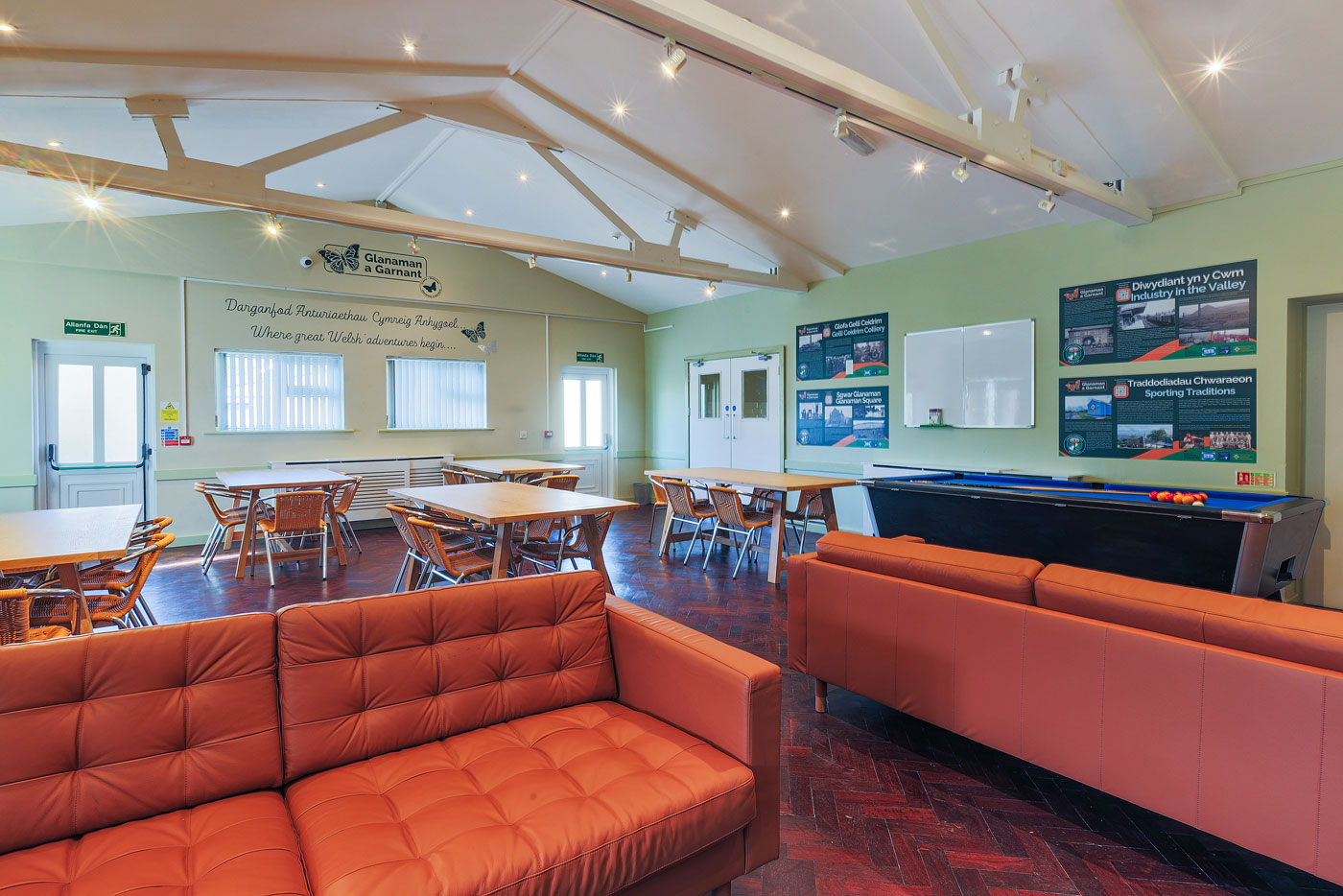 Rydyn ni wedi creu adeilad modern, croesawgar lle gall grwpiau ymlacio, cymdeithasu a gwneud y gorau o’u harhosiad. Mae’r ardal gymunedol fawr yn cynnwys: