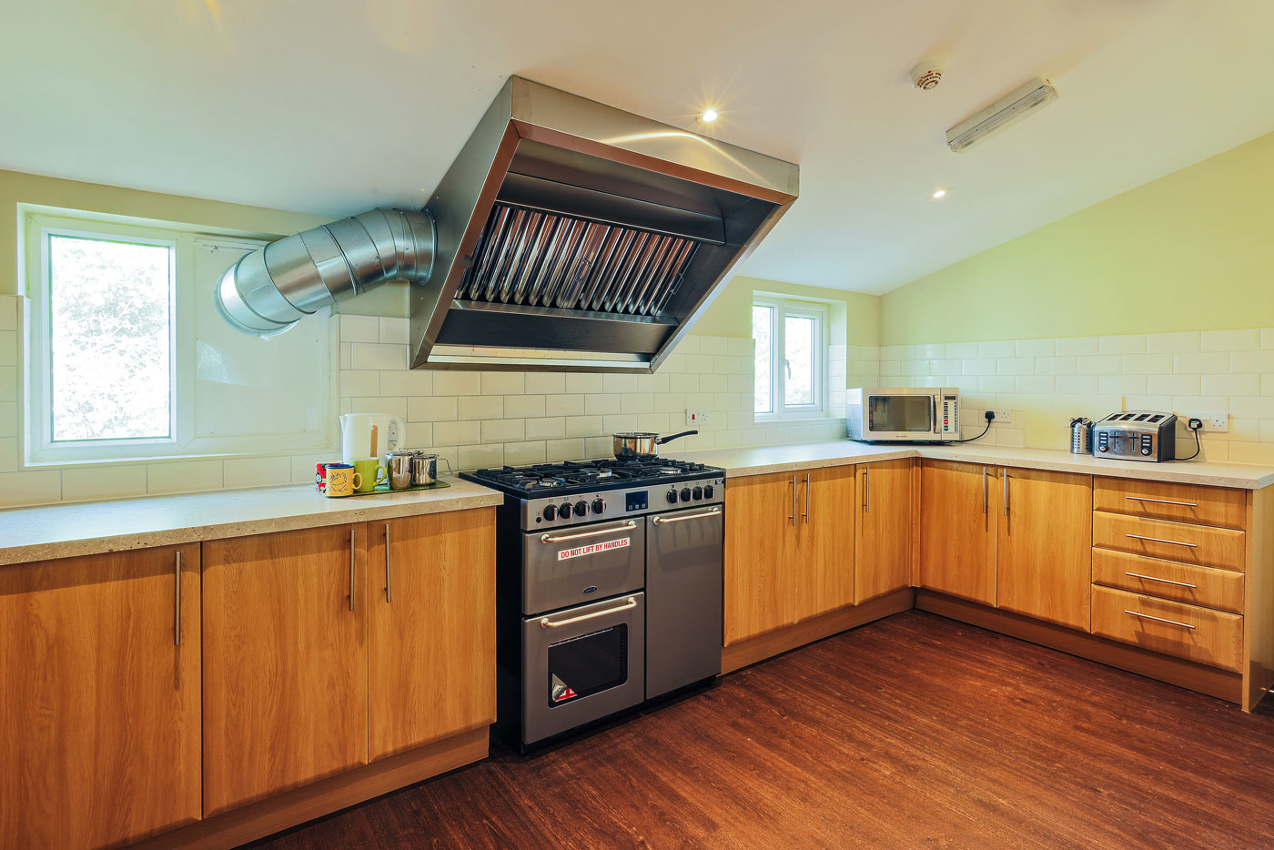 Mae’r gegin fawr wedi’i chyfarparu’n llawn gyda chyfleusterau coginio a storio, sy’n ei gwneud hi’n hawdd arlwyo ar gyfer grwpiau mawr.