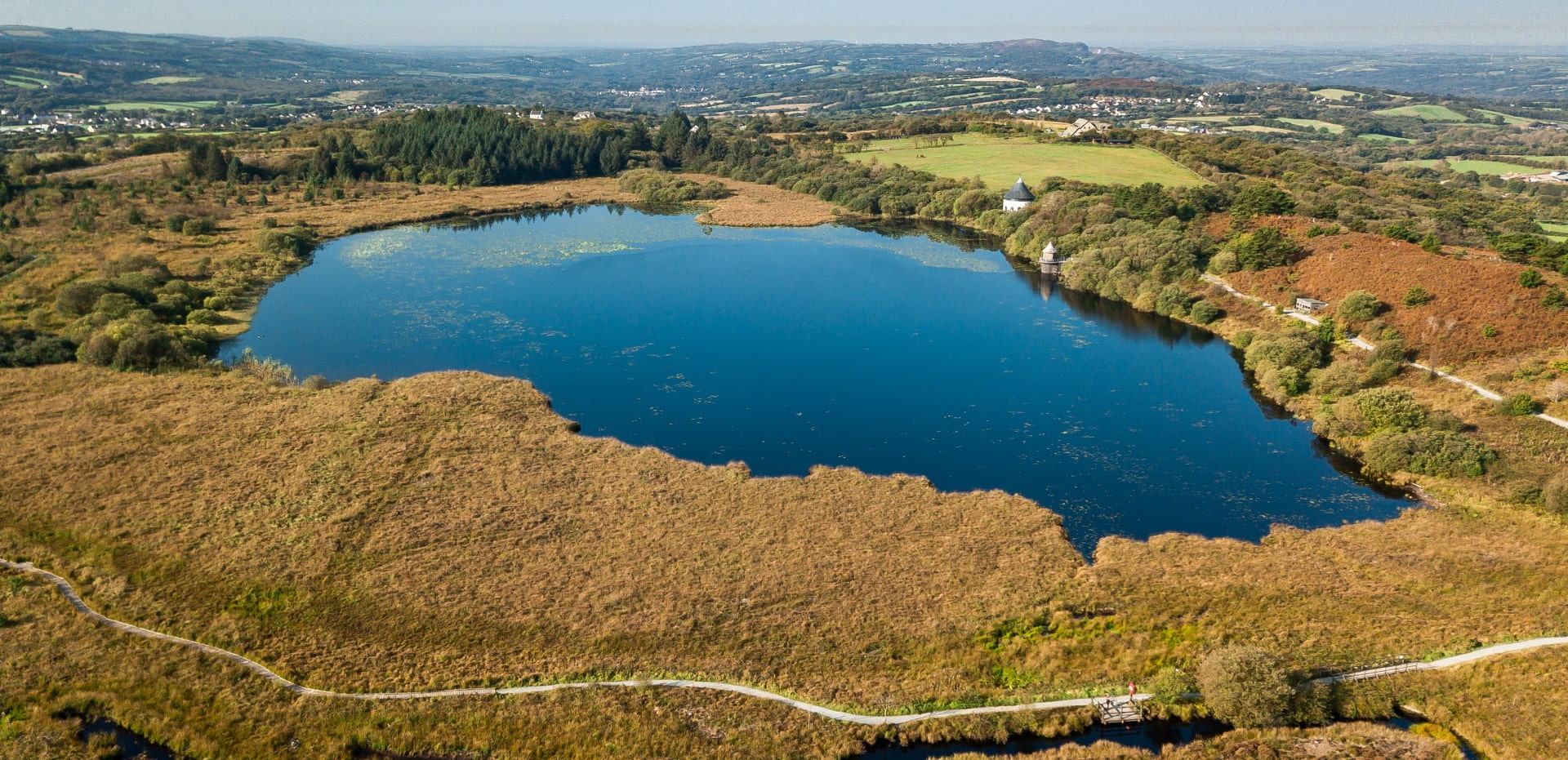 Mae canolfan ymwelwyr y Tŵr Darganfod yn sefyll wrth ymyl y llyn, yn cynnig golygfeydd godidog ac yn gartref i arddangosfeydd am reolaeth a hanes naturiol y parc. Mae’r cyfleusterau’n cynnwys caffi, safleoedd picnic, a thoiledau, pob un â darpariaethau ar gyfer ymwelwyr anabl.